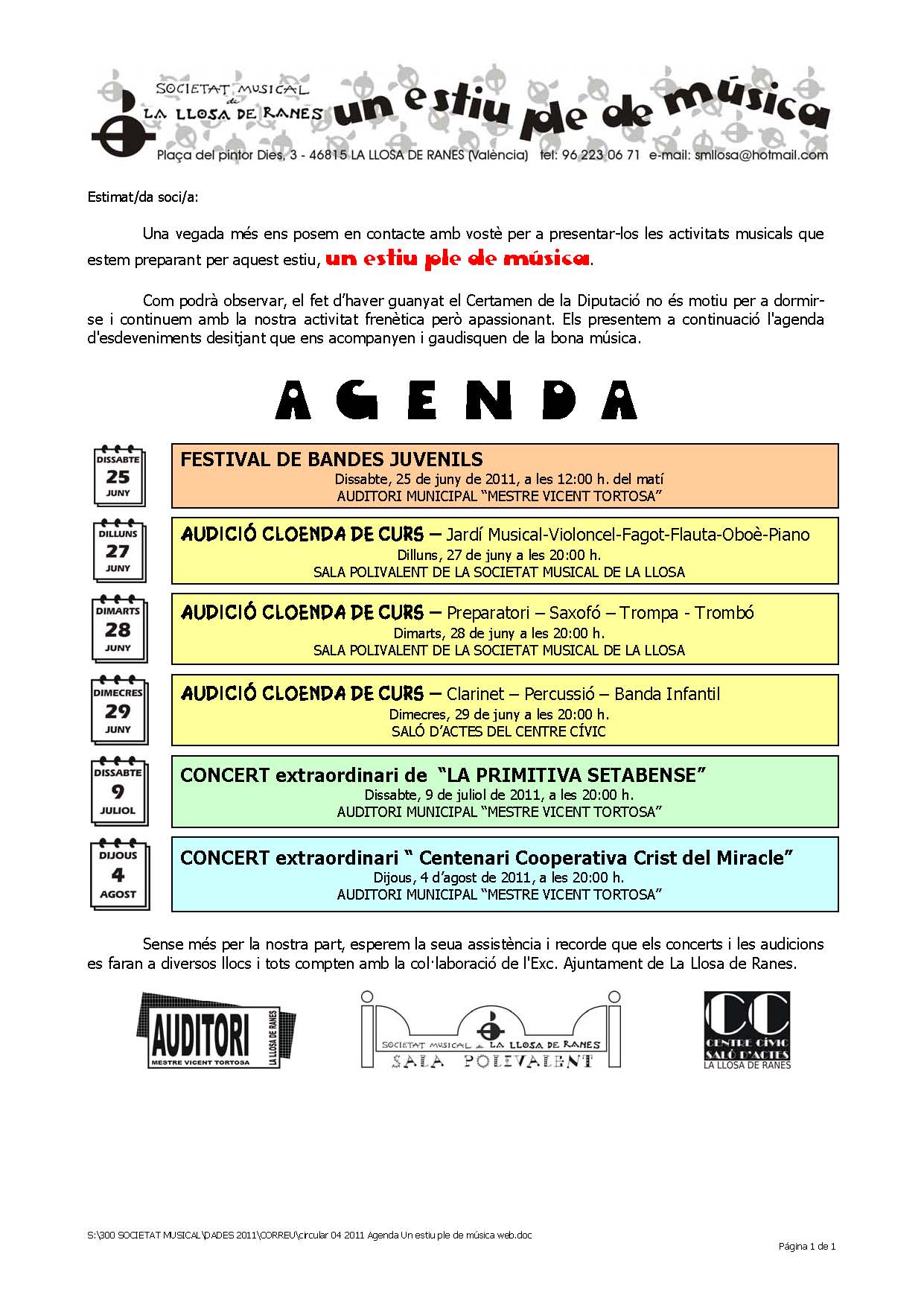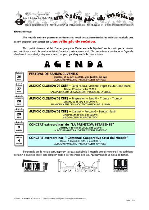 Una vegada més ens posem en contacte amb vostè per a presentar-los les activitats musicals que