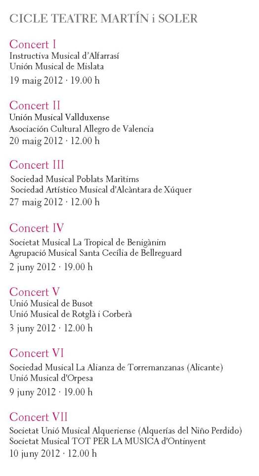 El cicle Teatre Martín i Soler de les bandes a les arts comença el proper cap de setmana amb dos concerts, dissabte 19 i diumenge 20 de maig.AVANÇ DE LA PROGRAMACIÓ DELS CONCERTS