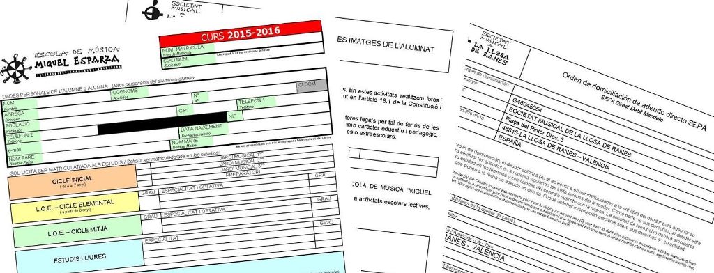 En virtut del que es disposa en l’art. 5 de la Llei Orgànica 15/1999, de 13 de desembre, de Protecció de Dades de Caràcter Personal, se li informa que les seves dades personals quedaran incorporats i seran tractats en els fitxers denominats “SOCIS” i/o “ALUMNES/PROFESSORS” segons corresponga, titularitat de la SOCIETAT MUSICAL DE LA LLOSA DE RANES amb la finalitat de realitzar la gestió integra de l’activitat de la nostra escola de música. Pot exercitar en qualsevol moment els seus drets d’accés, rectificació, cancel·lació i oposició de les seves dades de caràcter personal mitjançant el corresponent escrit, acompanyant fotocòpia de la seva D.N.I. dirigit a la SOCIETAT MUSICAL DE LA LLOSA DE RANES, Plaça del Pintor, Dies, nº 3 de La Llosa de Ranes (46815) València.