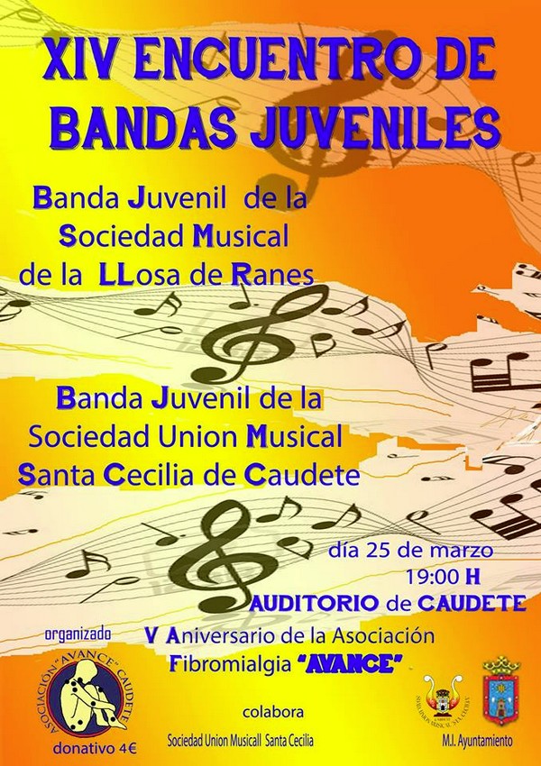 L’Encontre de Bandes Juvenils tindrà lloc el dissabte 25 de març de 2017 a l’Auditori de la localitat de Caudete i està organitzat per la Societat Unió Musical Santa Cecília de Caudete i emmarcat dins de la programació de primavera del mateix auditori.