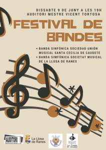 El proper dissabte 9 de juny tindrà lloc el FESTIVAL DE BANDES A L’AUDITORI, en el que participaran la Banda Simfònica de la Societat Unió Musical Santa Cecília de Caudete i la Banda Simfònica de la Societat Musical de la Llosa de Ranes.
