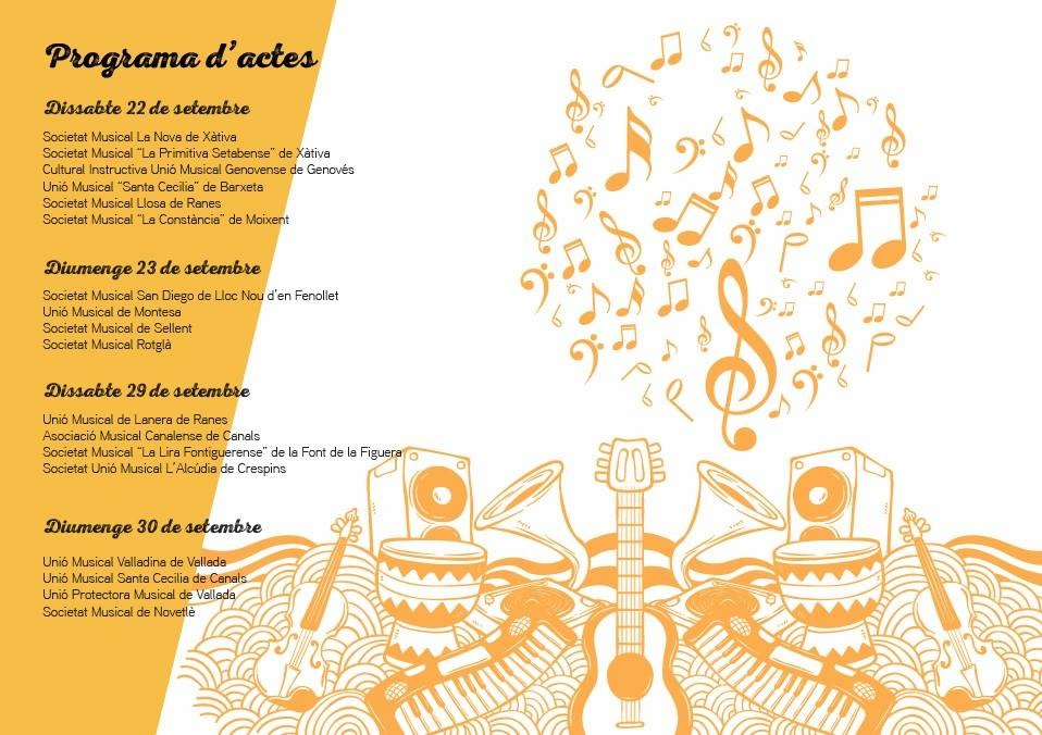 La Banda de la Societat Musical de la Llosa de Ranes participarà el dissabte 22 de setembre en el XXXIV Festival Comarcal de Bandes de Música de La Costera que se celebrarà en Novetlè. Ho farà en últim lloc i en la mateixa jornada en la que participaran SOCIETAT MUSICAL LA NOVA DE XÀTIVA, SOCIETAT MUSICAL LA PRIMITIVA SETABENSE DE XÀTIVA, CULTURAL INSTRUCTIVA UNIÓ MUSICAL GENOVENSE DE GENOVÉS, UNIÓ MUSICAL SANTA CECÍLIA DE BARXETA, SOCIETAT MUSICAL LA LLOSA DE RANES I SOCIETAT MUSICAL “LA CONSTÀNCIA” DE MOIXENT.