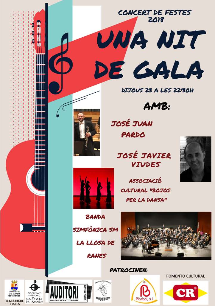 En «Una Nit de Gala» participaran l’Associació Cultural «Bojos per la Dansa» i dos intèrprets solistes; José Juan Pardo membre de l’OBC amb l’oboè i José Javier Viudes, tenor i membre del Cor de la Generalitat, tots acompanyats per la Banda Simfònica de la Societat Musical de la LLosa de Ranes i sota la direcció del mestre-director Rafael Grau.