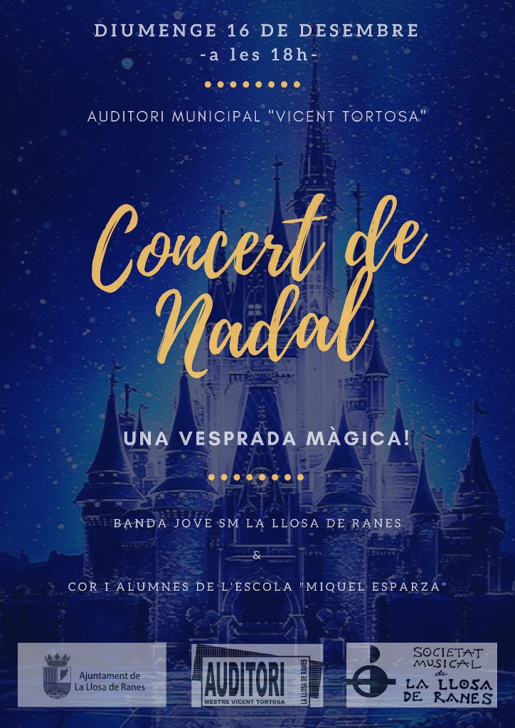 La primera part del concert estarà a càrrec de la banda jove. La segona part girarà en torn a la temàtica de «DISNEY». En ella participaran el Cor de l’escola de música Miguel Esparza i amb ells, els més menuts realitzant-nos unes magnífiques coreografíes. En aquesta segona part també comptarem amb les col·laboracions d’un reduit grup instrumental i de Pablo González al piano.