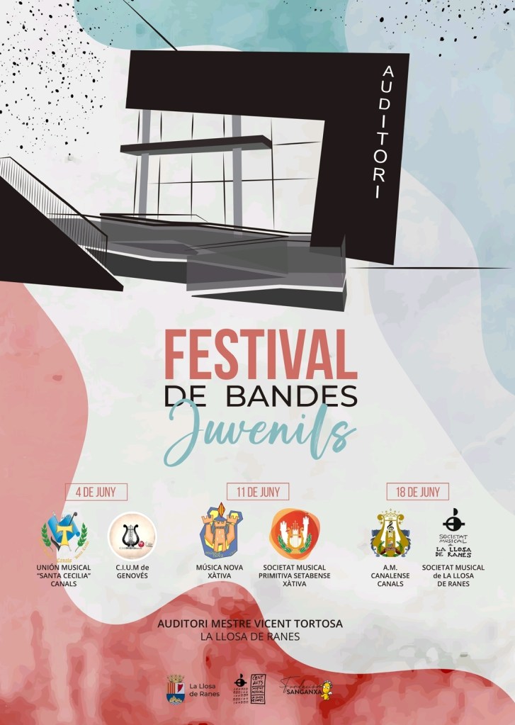 El proper dissabte 4 de juny a les 19h iniciarem el Festival de Bandes Juvenils a l’Auditori Municipal Mestre Vicent Tortosa Terol. Un cicle de tres jornades on seran protagonistes les bandes juvenils de: UM «Santa Cecília» de Canals, la CIUM Genovense, SAM «La Nova» de Xàtiva, la SM «Primitiva Setabense» de Xàtiva, l’Associació Musical Canalense de Canals i la Societat Musical de La Llosa de Ranes.